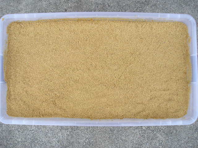 | 手順 | @衣装ケースに生オガを入れる(手でかき混ぜ、塊はなくす)。 A@に1Lずつフスマを入れ、混ぜる。 BAに1Lずつ水を入れ、混ぜる。 C混ぜあわせたものを手で上から押しならし、蓋をする。 D1週間ごとに、均一にかき混ぜ、手で押しならす工程を繰り返す。 E約1か月間ほどで発酵マットの完成。 その後、2〜3週間熟成させるとよりよいマットの出来上がりです。 ※20度以上の場所に保管すると発酵が促進されます。 |